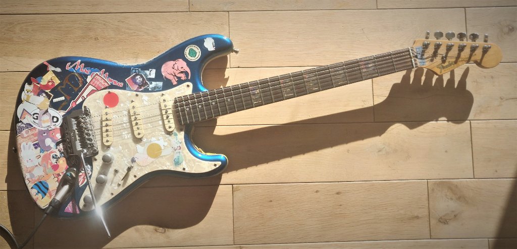 Guitare: Stratocaster Japan 1986 avec Floyd Rose by Fender (partiellement démonté, car inutile pour moi), montée avec des micros Van Zandt Blues, et trebble bleed révisée par Alain Raifort.