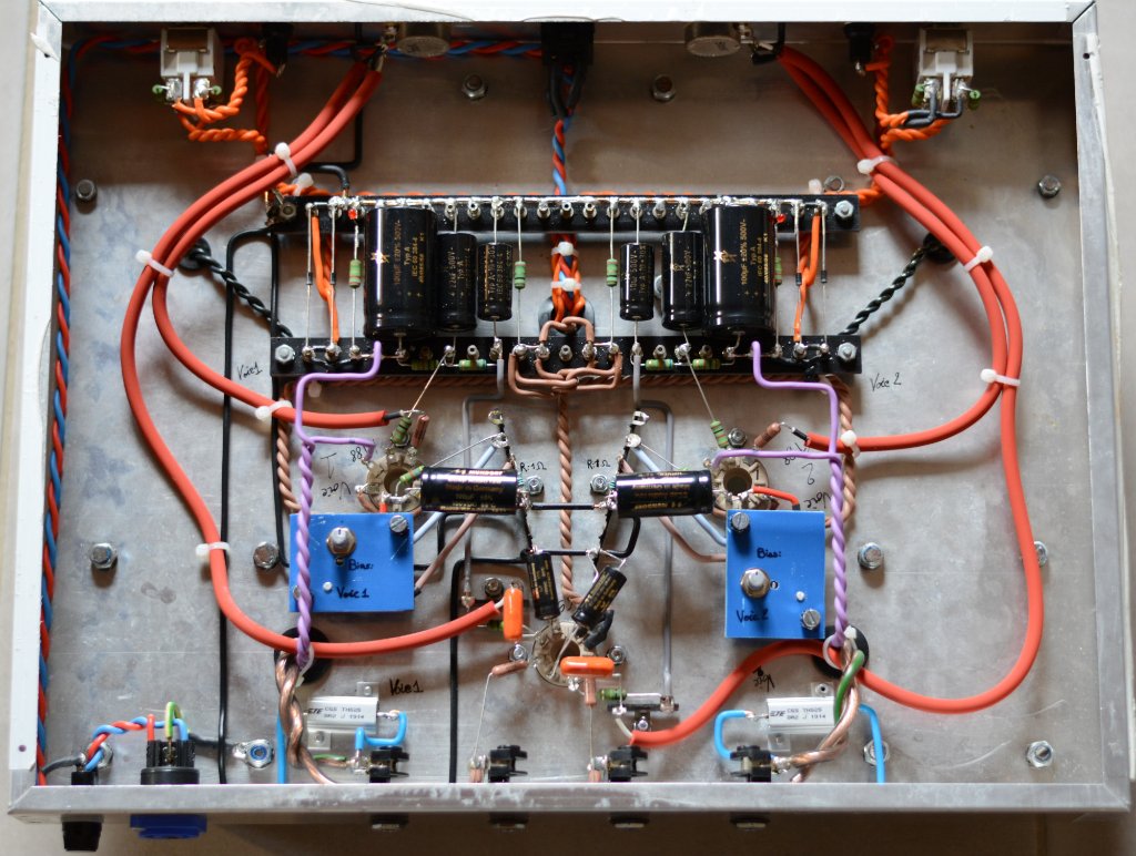 Petite MAJ de ce power amp enfin terminé avec ses bias réglables, résistance de protection hp. Je n'ai à ce jour, toujours pas testé le power amp :lol: (faute de réalisation des baffles, de temps...), mais il va bientôt rejoindre un caisson tolexé sur mesure.