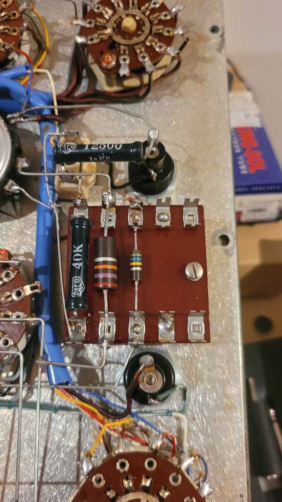 J'ouvre : Il y a une quinzaine de résistances et quelques condos film, certaines bobinées avec du fil résistif, il faudrait les dessouder et les tester une par une, mais avant de faire une connerie j'ai regardé les schémas, et ce 310B ne ressemble pas toujours à ce qu'on trouve en ligne, certaines résistances n'ont pas la même valeur, pourtant tout à l'air d'origine.