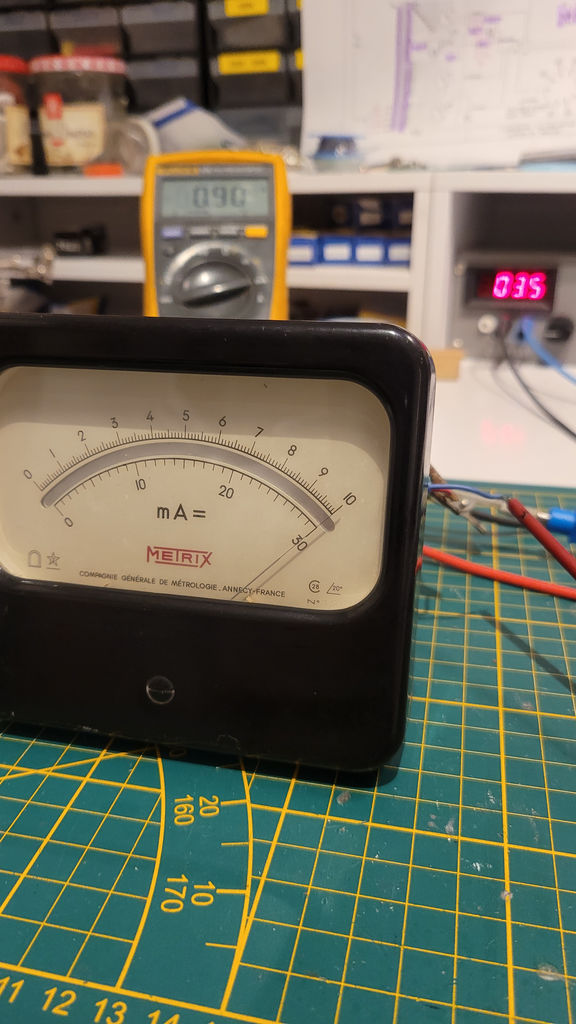 Il me reste une chose à vérifier, c'est R10 qui est en série avec le galvanomètre. Elle fait 15.6 ohms alors qu'elle devrait faire plus en 30 et 40 ohms normalement. C'est une résistance bobinée avec du fil résistif, les autres sur le même principe sont encore bonnes, donc y'a pas de raison, mais je vais vérifier avec le galva en série si on a bien nos 50 ohms.