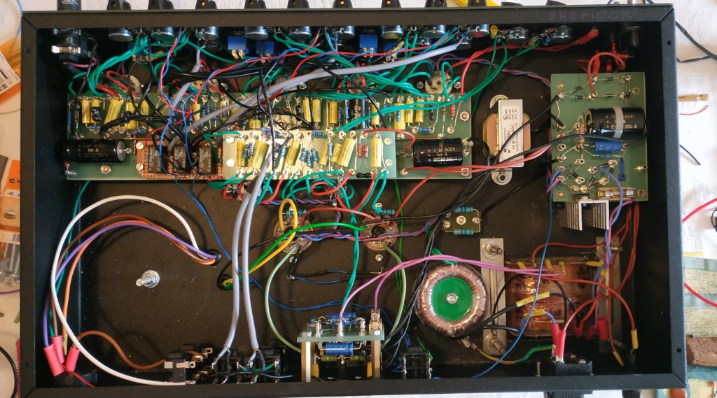 tu semblais davantage craindre la proximité des lampes de puissance avec les lampes de "préampli" qu'avec les transfos; une mauvaise expérience antérieure ?Les lampes de puissances sont un peu plus aérées. Pas beaucoup plus, mais j'ai la possibilité de les éloigner de la lampe de boucle et de déphasage.