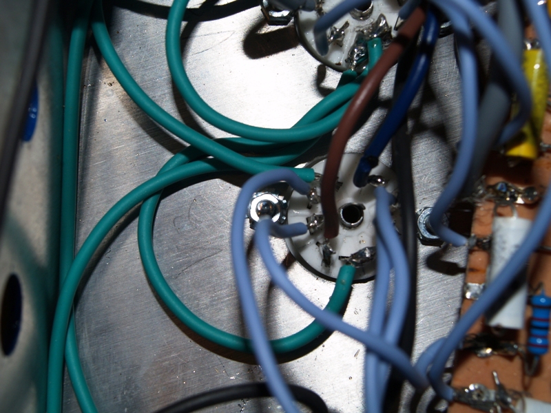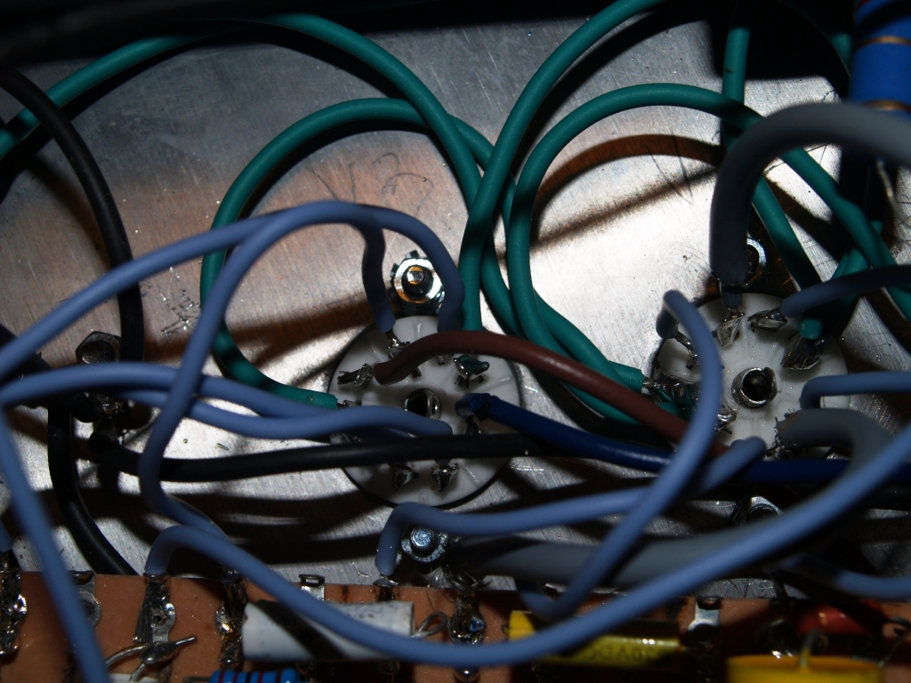 Bon, à première vue on peut toutefois de donner un premier conseil : il faut soigner le câblage. Tu n'as pas torsadé le chauffage filament et la plupart de tes câbles sont trop longs et disposés au petit-bonheur-la-chance. Les câbles doivent être plaqués contre le châssis et se croiser à angle droit (surtout quand il s'agit de câbles véhiculant des signaux bien différents, genre alimentation et signal de l'instrument par exemple).