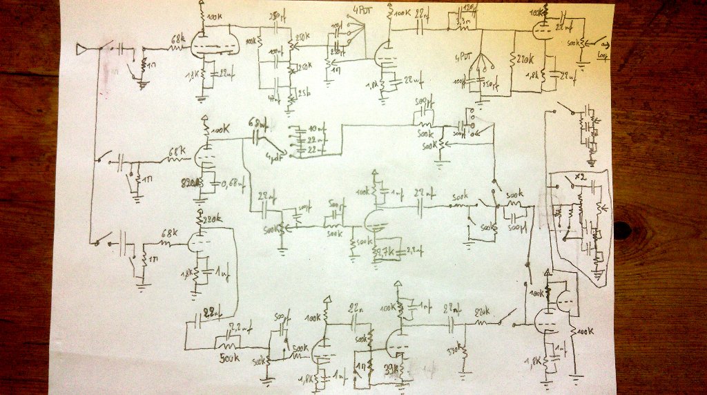 Ensuite, pour le clean, j'ai déjà testé ce que tu dis Arnaud (la suppression de la dernière triode), mais j'avais trouvé que ça sonnait moins bien à l'époque. Pour l'équilibrage des canaux, je fais ça après le potard de volume avec un pont diviseur. J'aime bien le son de ce canal quand le gain est à fond, donc, polariser la deuxième triode comme tu suggères enlève cette possibilité, mais dans un 4 canaux, ça se tient. Je vais étudier ça parce que ça gagnerait à être simplifié!!
