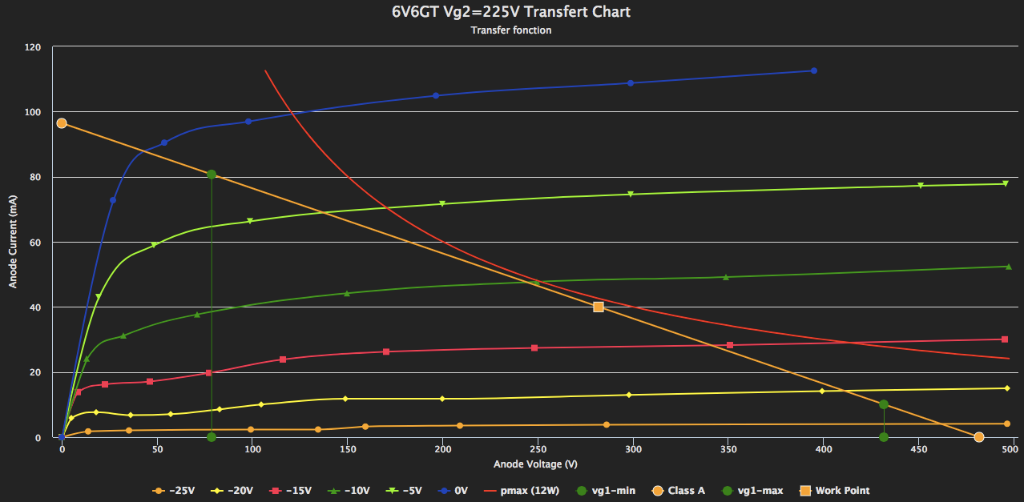 J'étais juste parti dans l'idée de faire quelque chose avec un variateur de puissance, au départ par un jeu de diviseurs de tension avant le HP, puis j'ai vu un transfo vendu chez Ampmaker qui avait une tension de sortie sélectionnable de 85 à 275V pour faire varier le B+ selon la description : et là j'ai commencé à me poser des questions et donc à tenter de voir comment se comporterais la lampe de puissance dans ces conditions. Et la question de la pose car, bien que j'ai compris qu'on devait travailler sur une plage donnée, je ne sais pas ce qu'il se passe physiquement de l'autre côté de Vg=0V