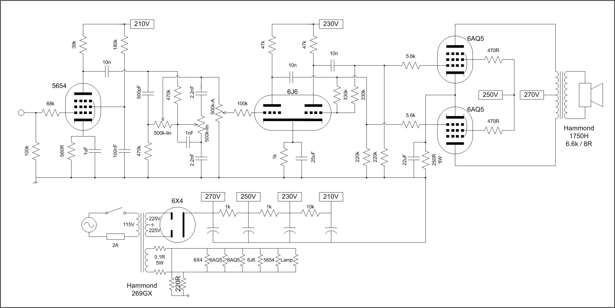 En furetant un peu sur le net, j'ai trouvé un schéma utilisant des tubes 6AQ5 et un transfo de puissance Hammond 369GX :