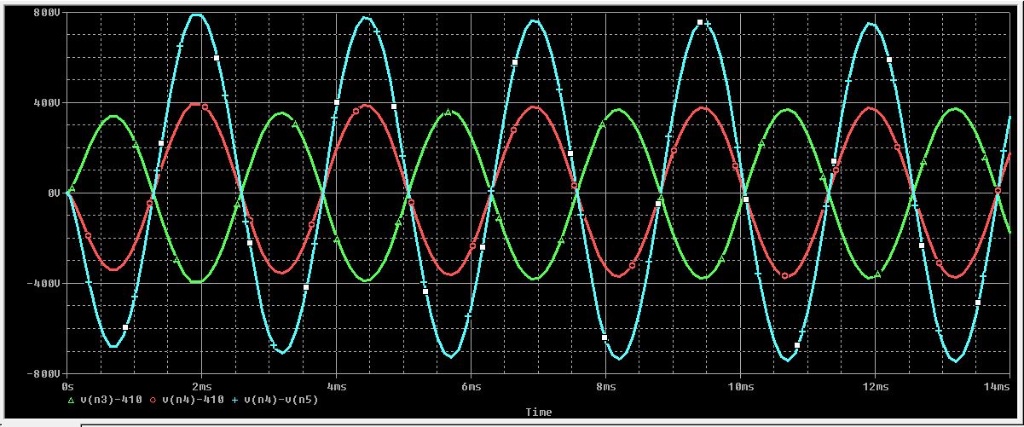 Ici, les anodes des tubes de sortie sont à respectivement 220VRMS et 231VRMS, et entre anodes on a bien 220 + 231VRMS = 451VRMS (ou encore 639Vcrête, mais on s'en fout pas mal, notamment pour la résistance de corrective filter)
