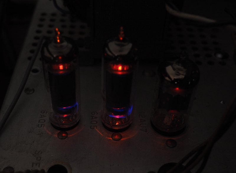 Enfin j'ai ajouté un étage d'amplification à la trainwreck (12AX7 biasée froid) désactivable via un switch DPDT (absent du schéma mais visible sur les photos)