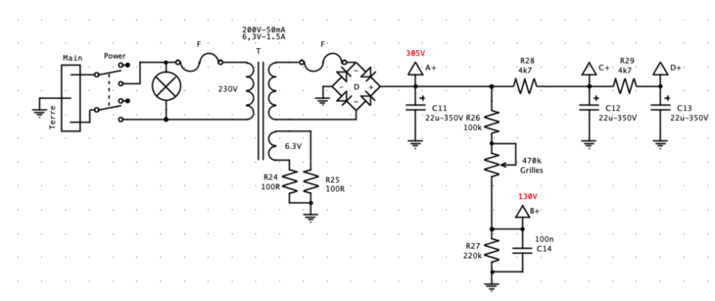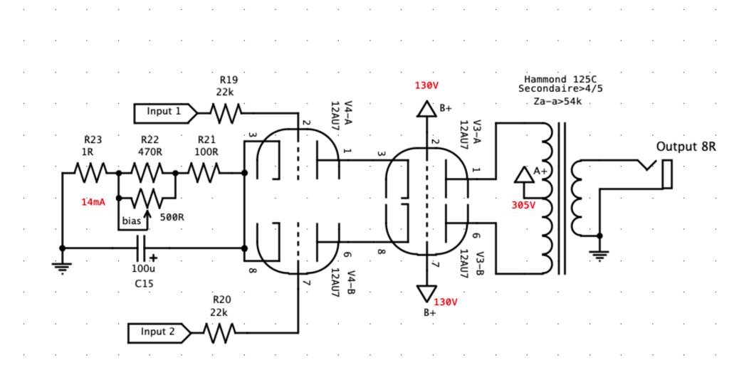 Comme vous pouvez le voir, je suis en fixed bias sur les grilles de V3. J'ai tenté une autre méthode (grid-leak bias) mais je n'arrivais pas à avoir les tensions voulues, même en faisant varier la résistance de "leak". Je restais autour de 20V, ce qui me faisait fonctionner comme une triode...