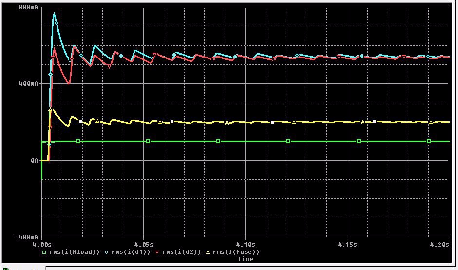 Voici les courants : dans la charge, courant = zéro, c'est bien cool, par contre les courants dans les diodes sont loin d'être à zéro (500mA RMS) Et voici les tensions : certes la tension dans la charge est nulle, mais sinon ça barde ! (ça, c'est théorique : sur le Selmer dont je m'occupe, j'avais 150V sur les EL34, donc loin de zéro)