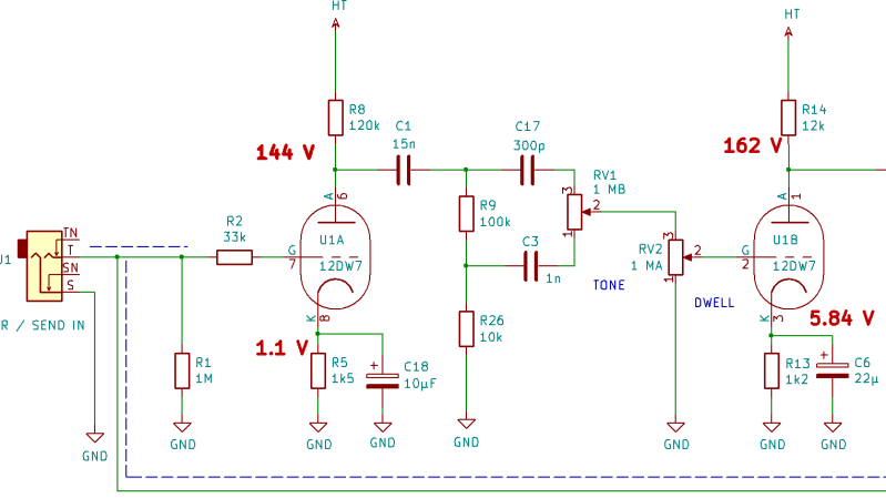 Comme le tonestack charge U1A on booste le gain avec C18 et le dwell est libéré de la 220k et de la 33k pour passer à 1Mo au lieu de 500k. On retrouve alors le même gain pour les mediums en remontant légèrement le DWELL. C'est une espèce de TS traditionnel tronqué qui ferait la chasse aux basses ( désagréables en reverb). Le 15n et les 110k forment un PH à 100Hz et le 15n isole le 300p qui peut être en Silver Mica !