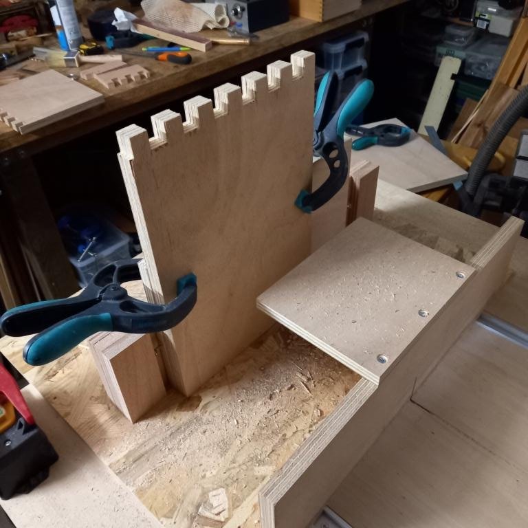 Je suis parti sur du ctp de 18mm et j'ai fabriqué un outillage pour faire les découpes des queues droites à la scie circulaire.