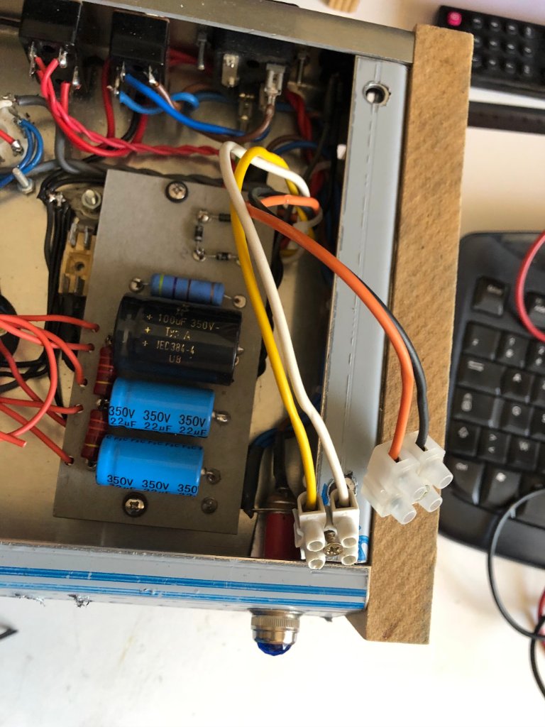 J'ai donc passé le fusible sur un des deux points du 6,3v, isolé le point milieu du 6,3v du chassis, d'ailleurs ce sont deux enroulements séparés, il y a deux fils gris (utilisés) et deux fils noirs reliés ensemble qui constituent le point milieu. J'ai changé le jack de la carte relais pour un tout plastique (style marshall) pour éviter les boucles intempestives.