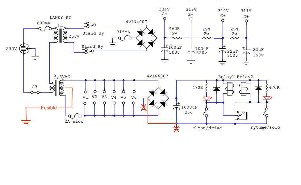 Ce qui est déroutant (cf schéma ampli) c'est que même le fusible 2A du point milieu grillé, le chauffage et l'alim relais fonctionnent encore :shifty: Je ne comprends pas bien la logique du montage de ce fusible sur le Laney d'origine...