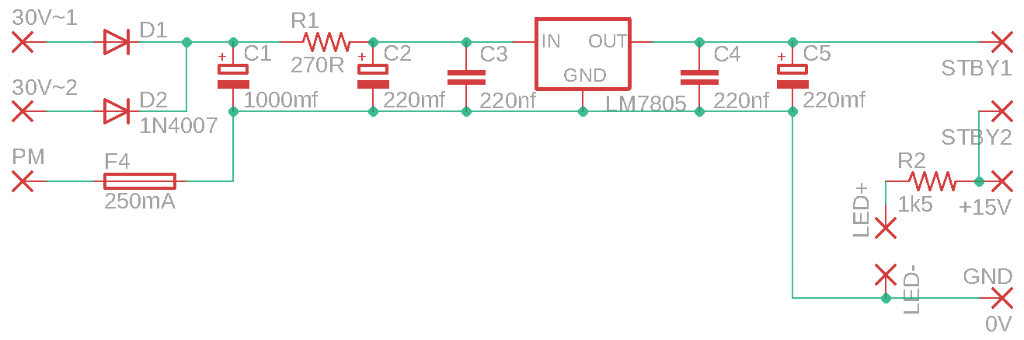 La justification de R1 dans le montage initial est que le 7805 ne supporte pas une tension d'entrée supérieure à 35V que l'on dépasse largement en redressant 30V en double alternance (la tension redressée montera jusqu'à 30 √2 soit 42V); c'est le même montage que lorsque tu passes de A+ à B+ sur la HT: une résistance pour chuter la tension suivie d'un condo "réservoir".