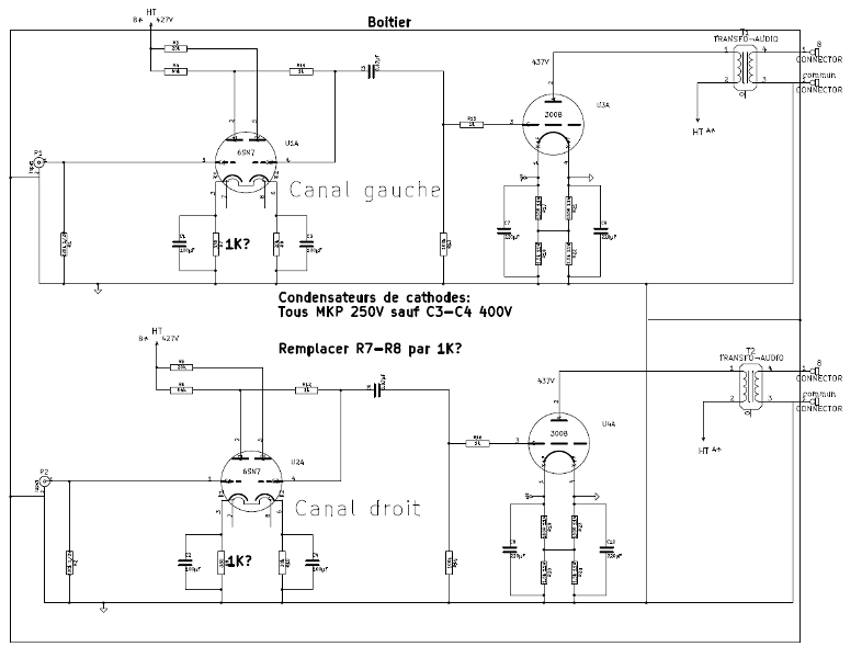 Bref, il faut ré-assortir tout le reste à cette nouvelle triode. Tout d'abord attention au circuit du chauffage de la deuxième triode, il doit être polarisé au moins à 200V via un point milieu entre deux résistances de quelques kΩ. Chaque double triode s'occupe donc de la voie de droite et de gauche. Une pour l'entrée l'autre pour le drive pour chaque voie avec chauffage distinct pour les deux : polarisé au r0V pour la première et à +250V pour la deuxième.