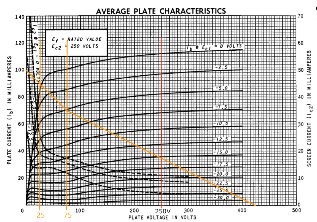 Entre le point de repos à 250V et le point à 75V, par abus de langage on pourrait dire qu'on est en "classe A", i.e. les 2 tubes conduisent : la différence de potentiels entre les anodes des 2 tubes est de (250V - 75V) x 2 soit 350V (la tension DC n'intervient pas car elle disparait dans la soustraction)
