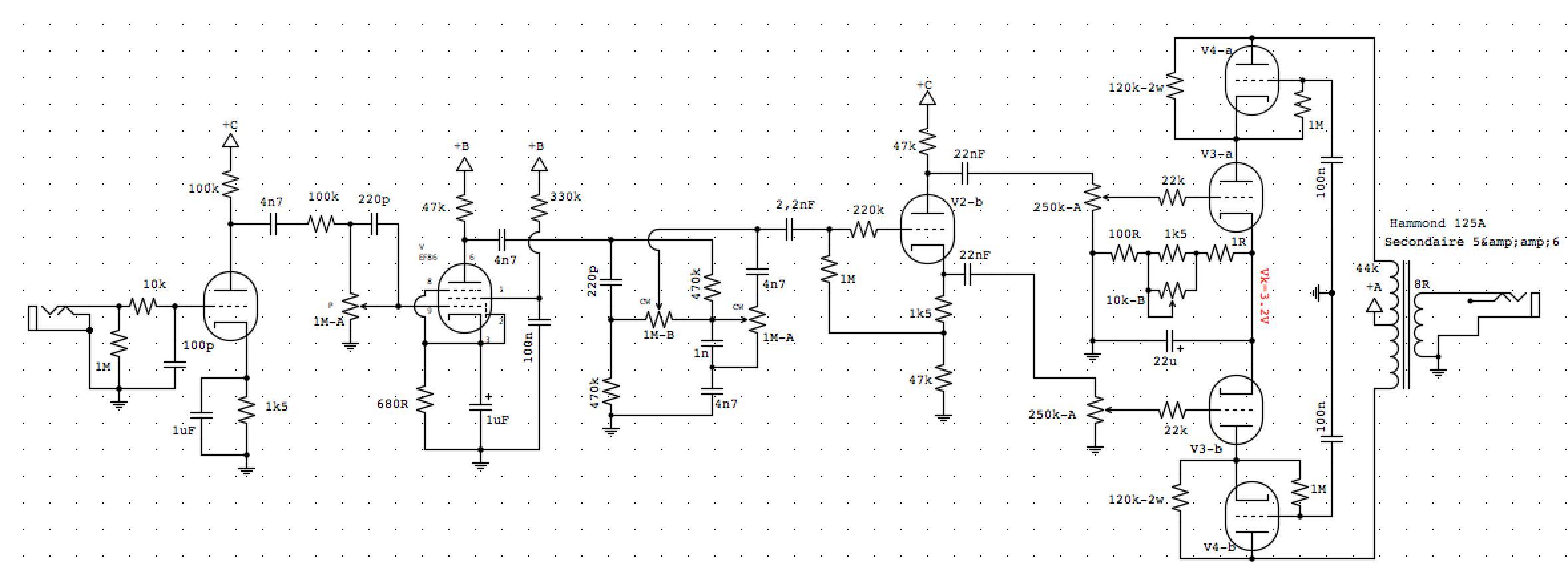 j'ai pondu un schéma de l'ampli au complet (l'alim n'y est pas représentée, mais est identique à celle du G1V3). Je reste donc sur une typologie avec EF86 (vous remarquerez que l'on est assez proche du schéma que j'ai fait pour ChopSauce), avec un Tone Stack (TS) façon tilt+Mid cut.