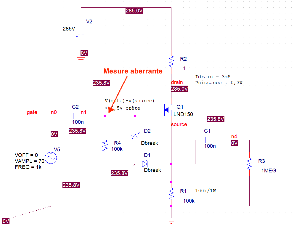 PI du 5E3 : CF à base de LND150 : On remarque une polarisation analogue (grille - cathode ou gate-source). Dorénavant, quand je tomberai sur une polarisation de ce genre, j'espère qu'une petite lumière rouge de warning s'éclairera dans ma caboche