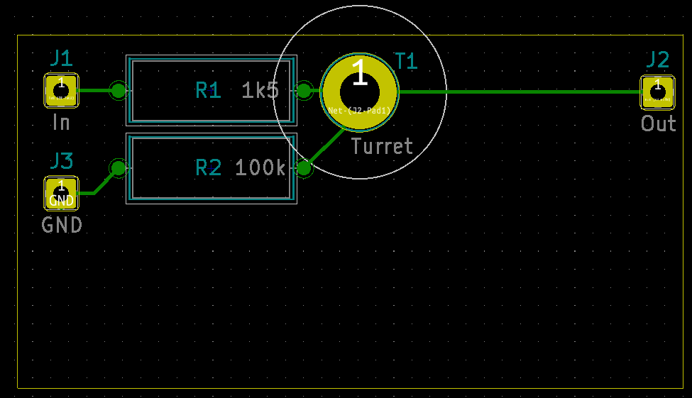 - Ajout d'un symbole turret dans le schéma (ça frotte un peu, mais après tout on ajoute les connecteurs, et le turret est un connecteur, quoi) => le turret est systématiquement pris en compte par pcbnew et affecté au bon "net"