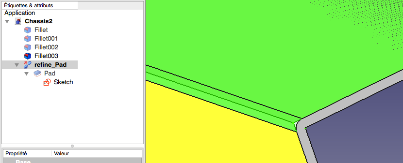 Ah merci, c'est plus clair, mais ce n'est pas ça : j'ai un peu trop joué avec "refine" et je me retrouve avec un refine pad qui fout la zone avec ses coins carrés qui recouvrent le congé ... (le "refine", c'était pour virer des traits de construction, dans un tuto que j'avais suivi ça marchait bien mais j'ai dû faire une c*ie)