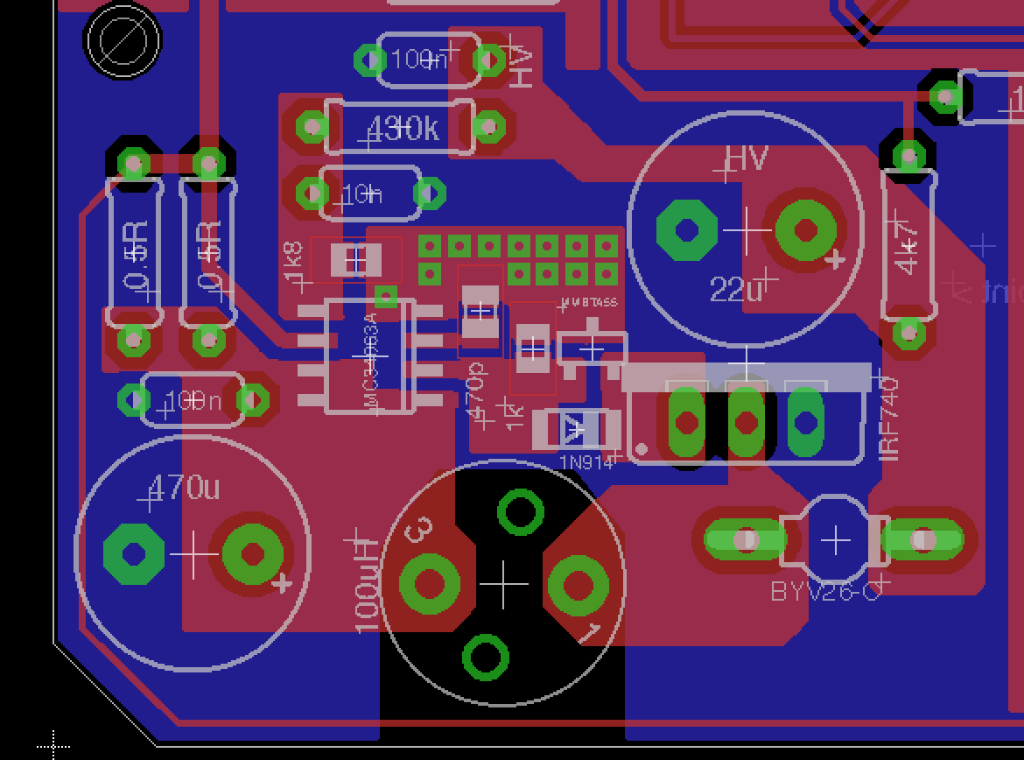 Voici les schéma et layout : Le circuit repose sur une puce dédiée de chez Texas Instrument, la UC3843A.
