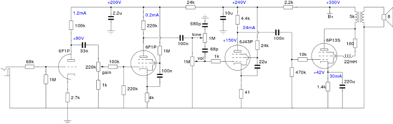 Je viens de finir mon projet hi-fi de l'année 2014, je peux reprendre ce projet ci car j'ai toujours un 12" qui dort sur une étagère avec 1 × 6F1P + 1 × 6Z43P + 1 × 6P13S.