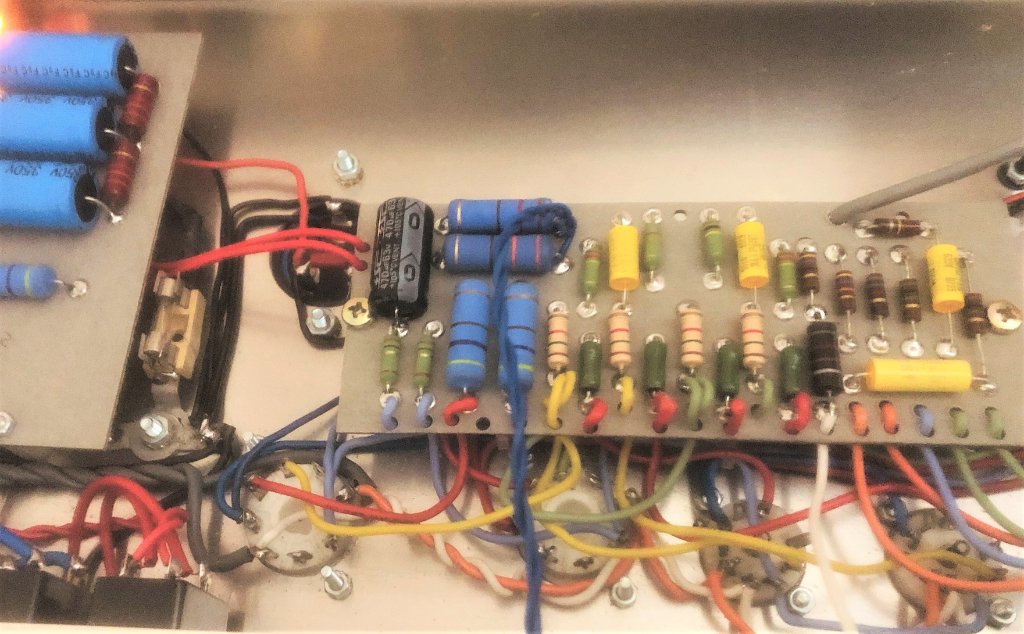 J'ai donc cherché coté filtrage de l'alim : J'avais alimenté le module avec le B+ comme préconisé sur le kit et mesuré 326v à l'entrée alim du module. Le filtrage au B+ passe par la capa de tête en 100mf puis R 460R et une capa de 22mf. J'ai ensuite alimenté le module sur le D+ (311v), la ronflette a presque totalement disparu mais j'ai pas mal de souffle sur le retour de la boucle, mais avec une bonne réserve de gain. Lorsque je branche un signal niveau ligne sur l'entrée du module, le niveau du send me semble un peu faiblard, j'ai taillé le pont diviseur d'entrée à 1M/100k et utilisé l'entrée A du module. J'ai aussi testé avec l'entrée B (sans le diviseur de tension) ça me semble plus adapté, j'ai plus de gain d'entrée, à voir avec un préamp guitare.