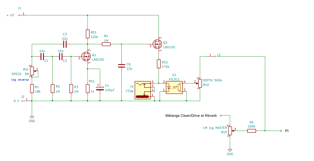 Un problème sur ton schéma me semble être le mélange de trop de signaux en entrée du potar de master; placer l'action du trémolo juste après, comme sur le schéma de jptrol un peu plus haut viewtopic.php?p=104989#p104989, en modifiant les branchements comme ci-dessous, me semblerait préférable: On perd également un peu de niveau de sortie...
