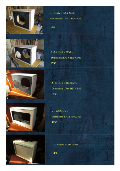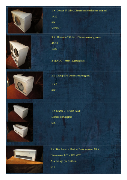 Je vends divers cabs de ma production ...Têtes, Combos et enceintes le tout en CP de bouleau 15 mm . Certains sont nus, d'autres habillés ...