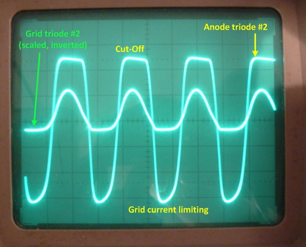 Dans le cas du « grid current limiting », la déformation du signal se fait dès la grille d’entrée du tube (commentaire en vert), et le tube amplifie ce signal déformé en entrée.