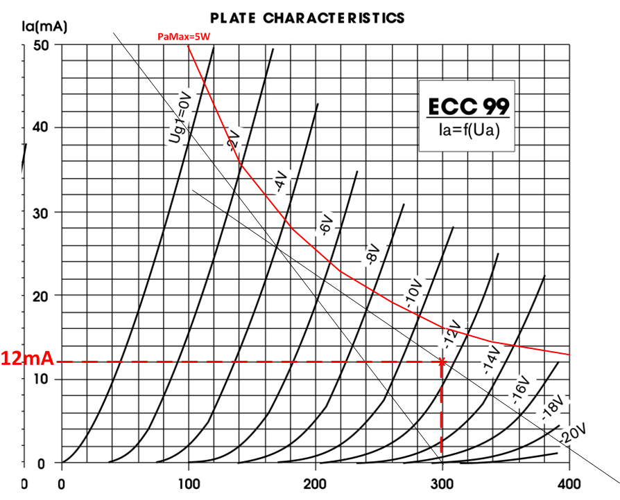 ) en droite de charge PP, en partant du principe que la tension d’anode sera à 300V et le point de bias à 12mA environ