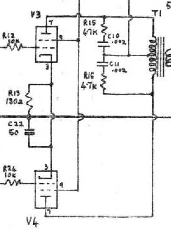 Si je zoome sur la partie qui m'intéresse (autrement appelée "corrective filter" par RCA) : Pas de puissance indiquée pour le potentiomètre, et 200V indiqués pour la capa de 50nF