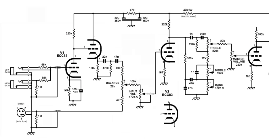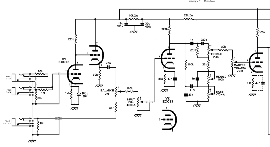 Bref, voilà un des schémas de DR103 comme base de réflexion (préamp, tronqué avant le PI) : Le préamp SAP : Le préamp JP : Selon un forum, M Huss aurait écrit : "When there's no cable inserted or the cable/footswitch is inserted but closed, the signal is somewhat shunted to ground, based on the BALANCE setting. When you open the footswitch, there's no ground and the signal goes straight through for a big boost. This is vaguely similar to the "tone stack lift" switches some (non-Hiwatt) amps have that disconnect the bottom of the tone stack from ground. » (je ne retrouve pas trace de ceci sur le site de M Huss, il s’est peut-être dit que c’était faux et l’a viré ?)
