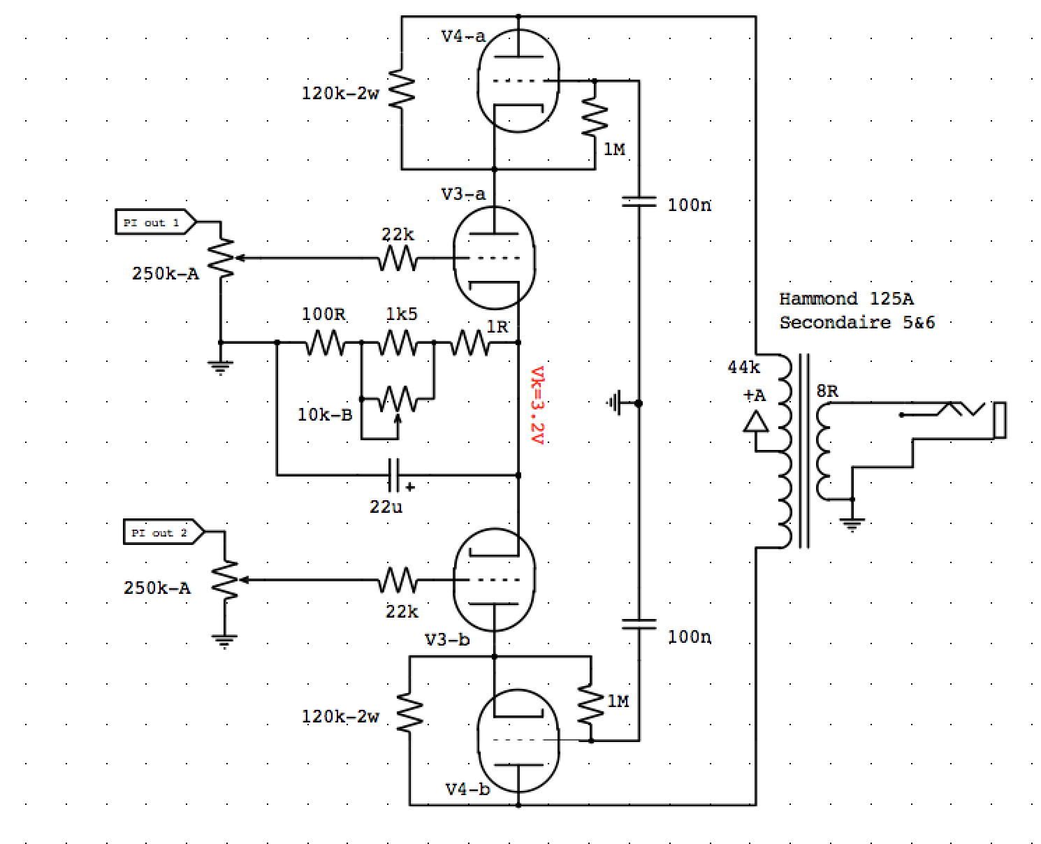 Voici un schéma rapide pour mieux comprendre de quoi je parle. C'est une extension du montage "High Current Cascode" tiré du 1er livre de Merlin Blencowe sur le préamp (p155). Bien sûr, les valeurs seront à ajuster. Pour le transfo de sortie, en utilisant la série 125 de Hammond, en extrapolant le tableau de branchements, j'en arrive à Zaa=44k pour Zout=8R avec les broches 5&6.