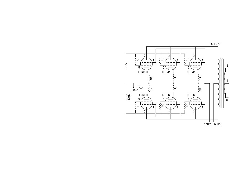 donc je partirais sur 6 x 6L6 avec 500V en Va et 450V en Vg, bias au repos à -45V. Transformateur avec 2k en primaire.