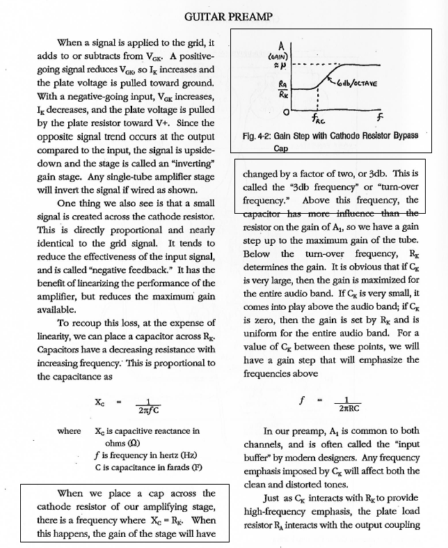 Dans le chapitre Guitar preamp section 4.3 je peux lire ceci (c'est au sujet de l'étage en cathode commune et plus particulièrement de la fréquence de coupure induite par la capa de découplage - j'ai encadré les points critiques :