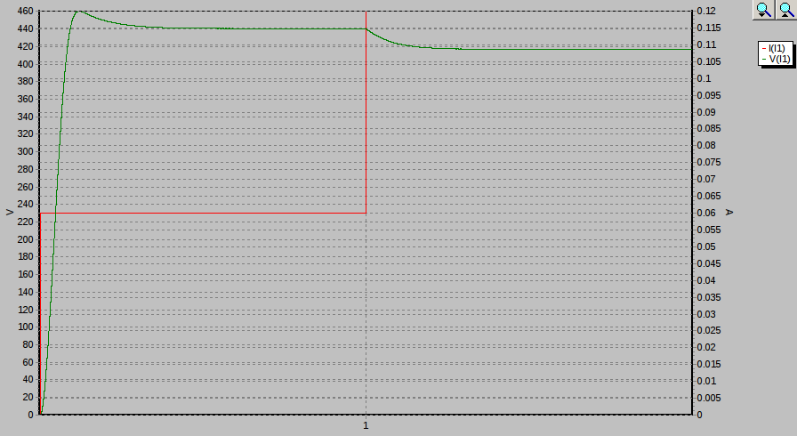 Voyons la scène au ralenti : On distingue ici très nettement la surtension de démarrage (440V) et la chute de tension en régime permanent avec seulement 300V en sortie, bon ce n’est pas très optimisé mais c’est pour comparer. Voyons ce que donne la réponse à un échelon d’intensité, que ce passe-t-il si notre guitariste se lance dans « shine on you crazy diamond » ? On voit clairement la tension de sortie d’alimentation osciller à très basse fréquence et mettre près d’une demi seconde à se stabiliser.
