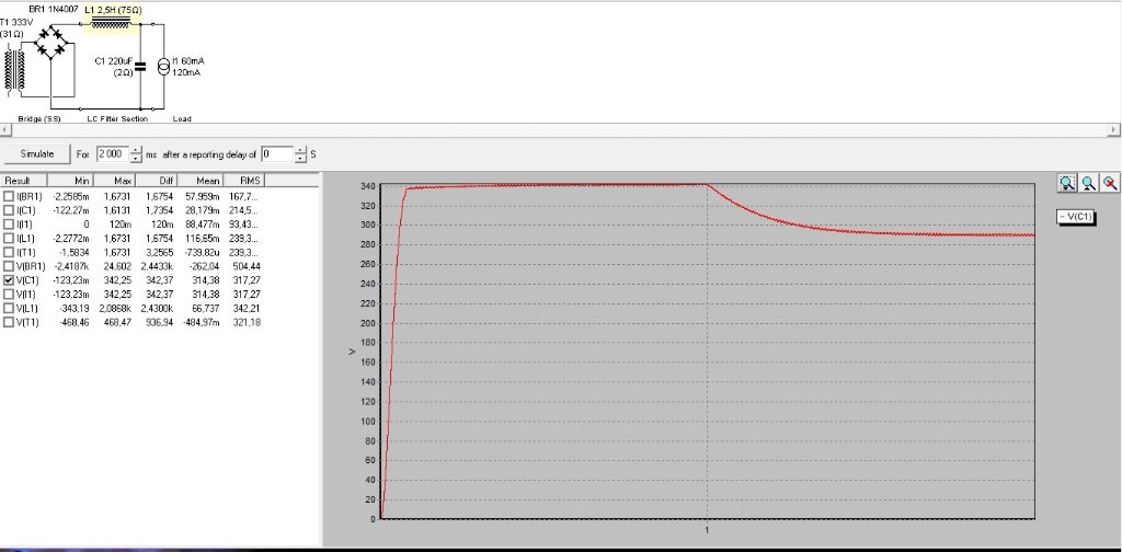 J’ai donc modélisé le circuit suivant : un géné 330Vac (30Ω), 4×1N4148 une self 2,6H 75Ω, un condo 220µF (2Ω) et une charge qui consomme progressivement de 0 à 80mA en 1sec puis brusquement 120mA pendant 1 seconde.