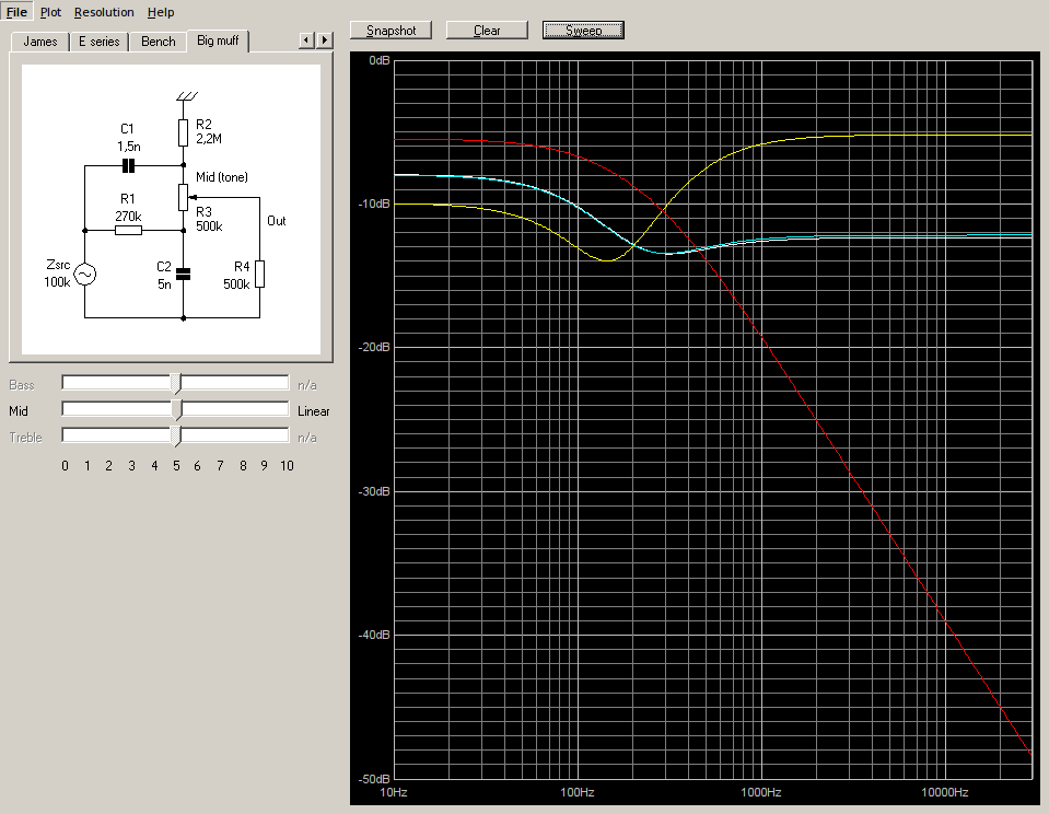 Pour le tone, il agit surtout sur les aigus. L'atténuation dans les graves est limitée (dû au pot 500k). Je pense que je gagnerais en clarté en baissant la valeur de la 470k.