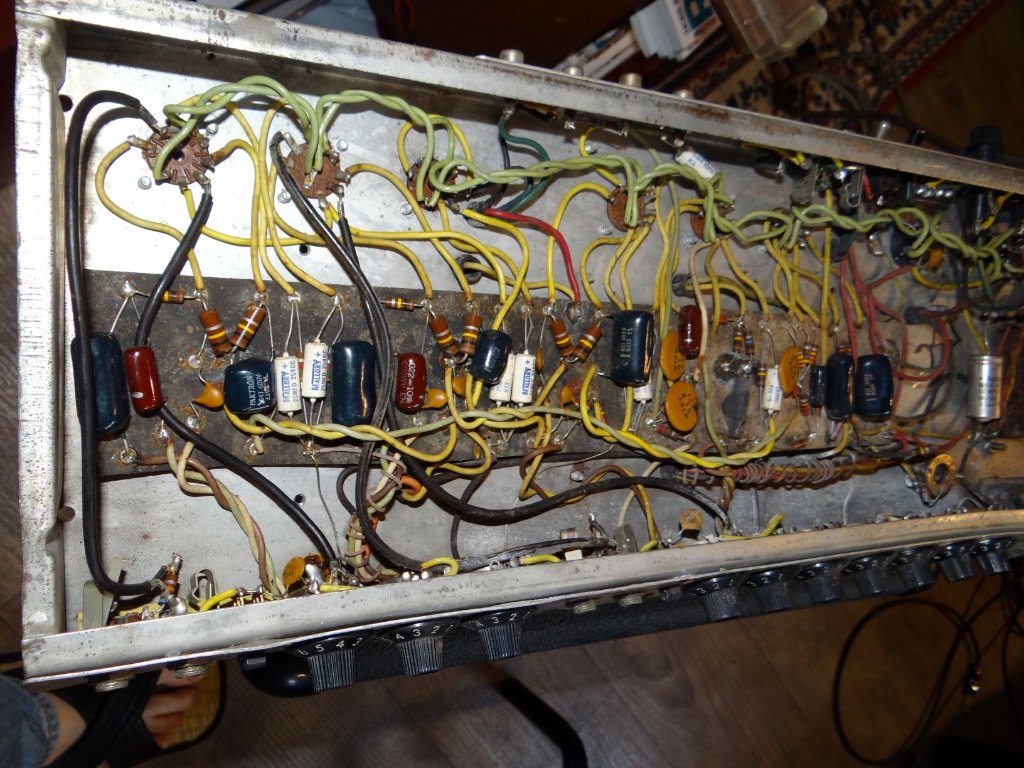 Si on en croit la photo du turret board (la plaque noire couverte de composants ! ) on dirait qu'elle est recouverte d'une couche de saleté à base de rouille... Ça risque de poser beaucoup de problèmes d'isolement... les supports de lampes doivent aussi être oxydé un max (les faire tremper dans du pétrole une nuit serait pa inutile)... je serais partisan comme Pote Gui de tout démonter, mettre le turret à nu et refaire un câblage propre ala blackface. Ça permettrait aussi de le passer en AB763 (circuit de bias)...