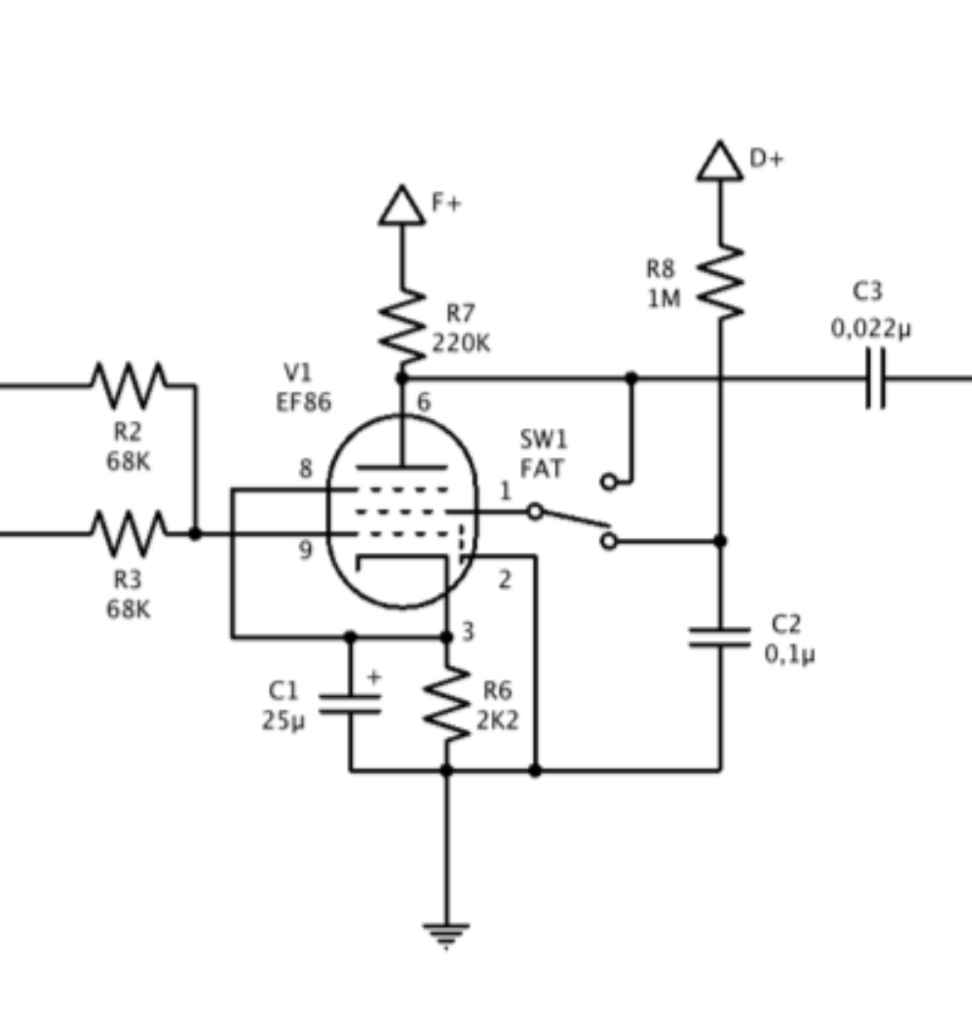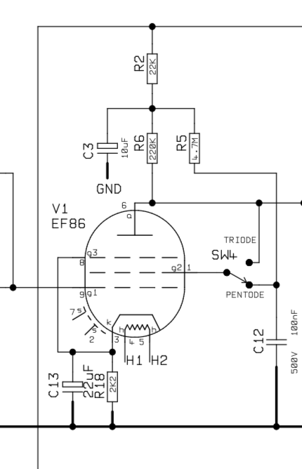 Je retravaille actuellement mon ampli basse et j'ai décidé (en pompant honteusement sur A-Wai) d'implanter un étage d'entrée à base d'ef86 avec un switch pentode triode pour proposer deux niveau de gain et venir saturer ou non les étages suivants.