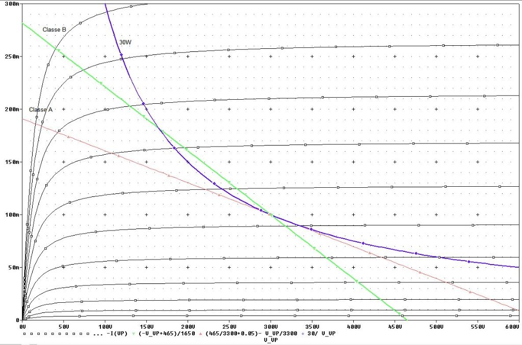 Donc au final le problème est de trouver un moyen de faire tourner cet étage de puissance avec 6600Ω, 465V et 30W de dissipation max sur la plaque. Donc avec un bias de 50mA on longe les 30W limites de plaque mais pour l'OT on est bon, enfin je crois.