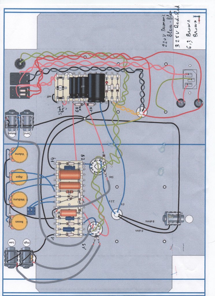Compare avec le schéma. Les deux 68k sont les résistances d'entrée. Elles sont soudées sur le support de lampe sur un layout et soudés sur les pins 1-17 et 2-18 de la plaque sur l'autre... Quant au fil bleu, j'ignore, mais si c'est bien le repère 20 sur le G5 alors ça devrait aller à une anode... Ou un switch comme sur l'autre layout !