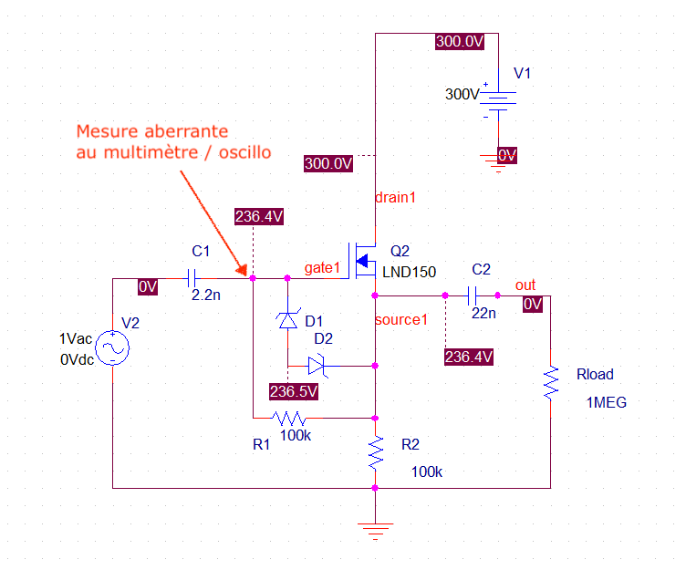 Bref, j'ai changé le LND150 , ça fonctionne et j'ai pris quelques mesures : horreur, sur la gate du LND150, je mesurais 55V DC au lieu d'une tension équivalente à celle mesurée sur la source !
