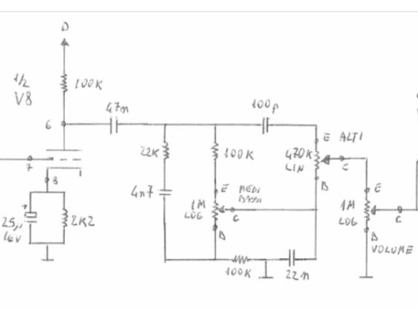 Et la polarisation zarb du 1er étage (de mémoire, j'ai déjà vu ça sur un vieil ampli italien, il y a des années de ça ; je ne sais pas trop pourquoi ils font comme ça, d'autant que le Viscount a un autre canal dont la première triode est, elle, polarisée de façon très classique avec un Rk // Ck à la cathode)