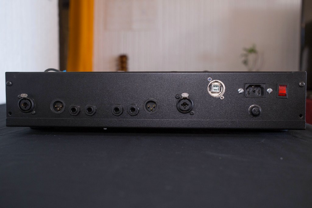 Les connectiques IO , les entrées en combo XLR/JACK , les sorties lignes en XLR, la boucle d'effet en TRS, l'USB et le secteur