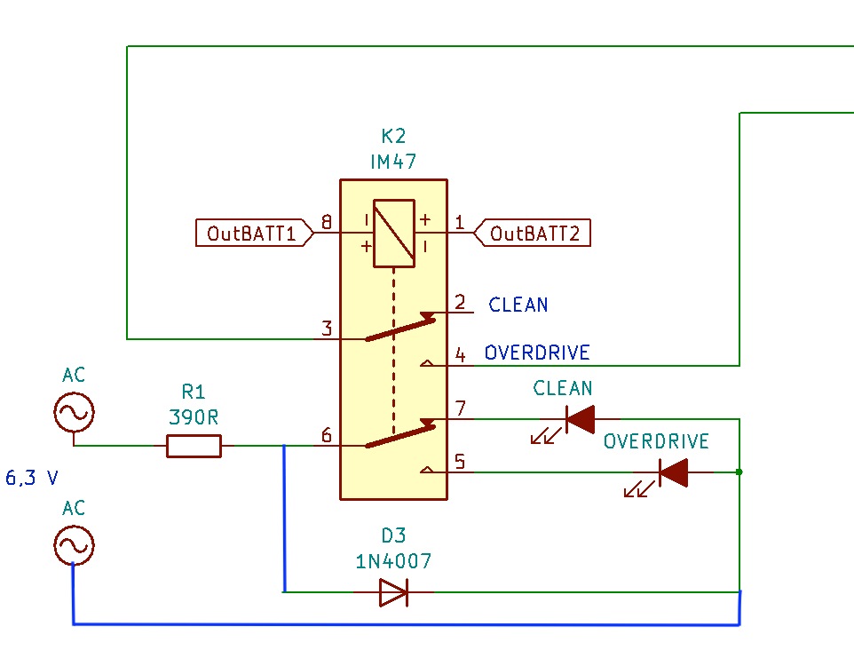 Prenons un cas courant : on doit commuter un canal CLEAN et un canal OVERDRIVE en insérant les étages OVERDRIVE entre le canal CLEAN et la puissance. On doit simultanément shunter avec une capa la résistance de cathode d'un étage du canal CLEAN pour booster son gain et aussi alimenter deux LEDs servant de voyant en façade , une pour le CLEAN , une pour l'OVERDRIVE. Attention : pour les LEDs , hors de question d'utiliser la pile , on aurait tout faux ! On alimente les LEDs avec le 6,3 V de chauffage en série avec une résistance de 390 ohms.