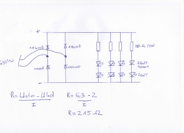 Si tu redresses 6,3V alternatifs, tu n'auras pas 6,3V en continu mais 6,3 x rac(2)=9V ce à quoi tu dois retirer 1,4V pour les diodes de redressement, ce qui nous fait 9-1,4=7,6V. De plus, si tu mets deux diodes en série sur chaque branche, alors ta chute de tension ne sera pas de 2V mais de 2 x 2V, soit 4V. Ensuite, es-tu bien sûr du courant consommé par tes diodes, parce que 0,2 mA, c'est dix fois moins que des diodes basse consommation...