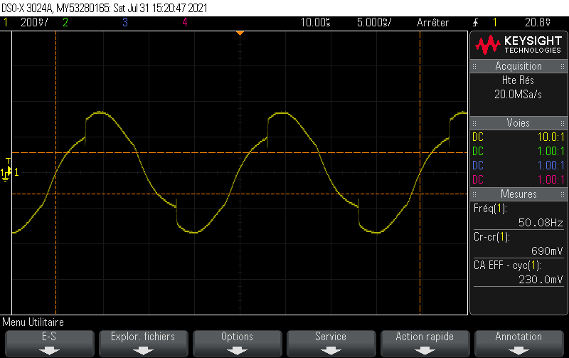 Pour référence, l'image suivante, c'est le canal crunch, volume à 0: Maintenant, le canal clair, volume à 0: Puis au réglage où j'ai le minimum de bruit de fond, environ à 9h: Et enfin, volume à mi course (là c'est la fête): Le bordel au volume 0 ne m'inquiète pas trop, j'ai un phénomène chez moi qui fout la zouille sur la terre, je n'ai jamais eu le temps de m'y pencher mais je l'ai aussi sur mon ampli hifi donc pas d'inquiétude pour l'ampli lui même. Mais par contre, le vrai problème c'est ce signal énorme quand on monte le volume... avec cette distorsion dégueulasse... Comme je chope du 50Hz, c'est pas facile à analyser...