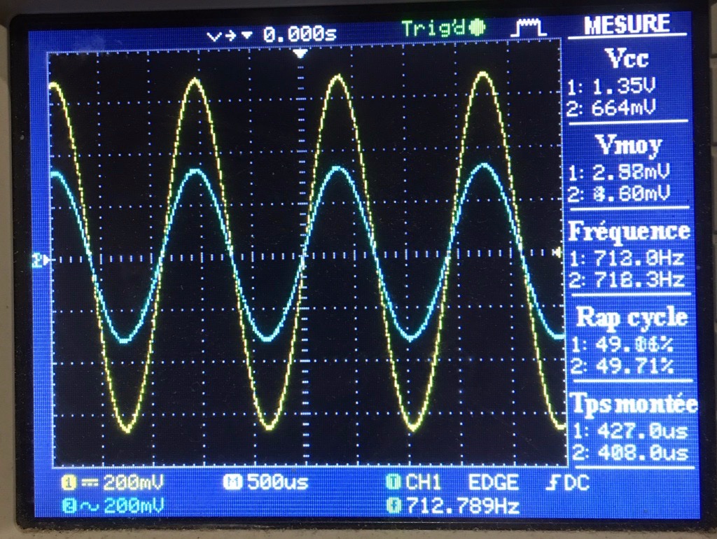 Mesure avec masse sans point milieu transfo et que j'effectue courbe jaune - courbe bleue, j'obtiens 1.35V - 664mV soit un signal de 686mV ; si je reprends l'image